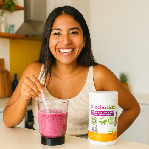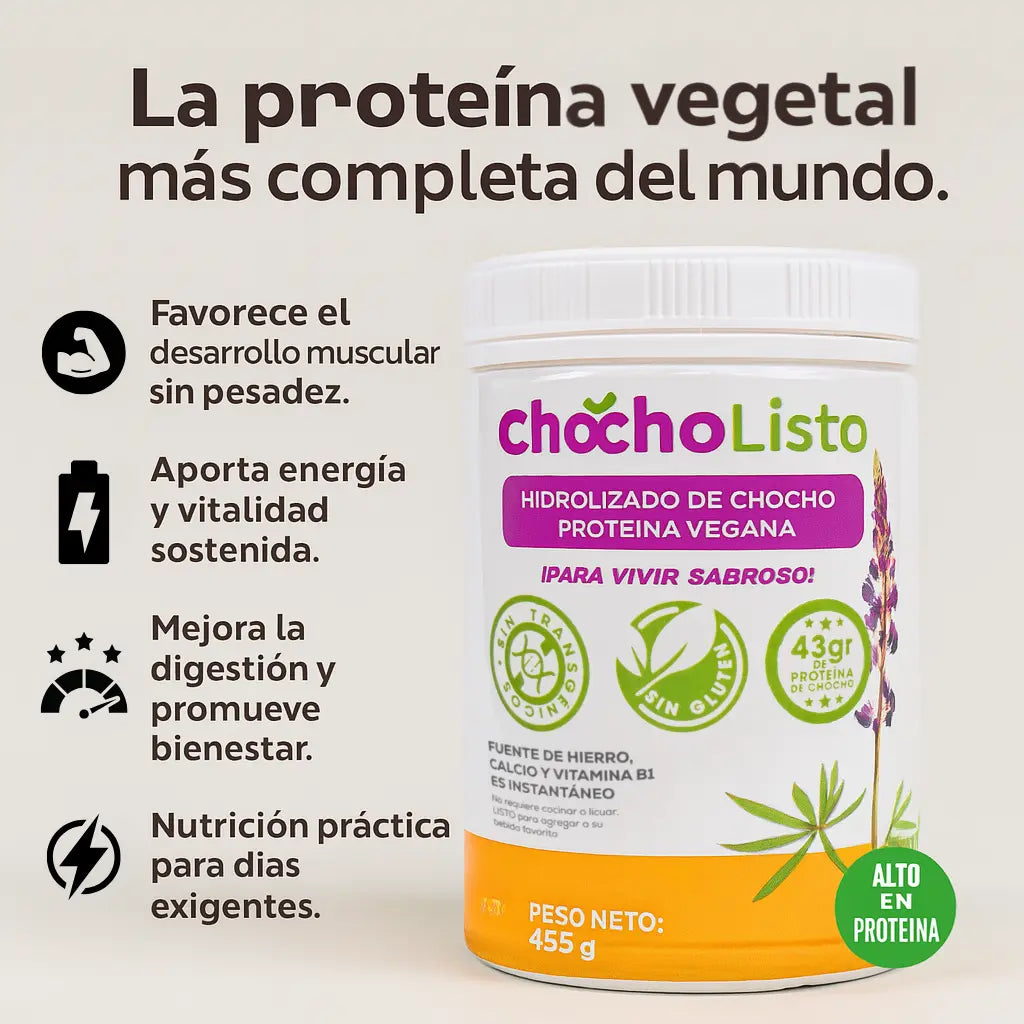 Chocholisto es un superalimento en polvo a base de chocho andino, la proteína vegetal más completa del mundo. Aporta todos los aminoácidos esenciales, hierro y calcio de origen natural. Versátil y fácil de usar en smoothies, bowls o postres, brinda energía estable y verdadera saciedad en tu día a día.
